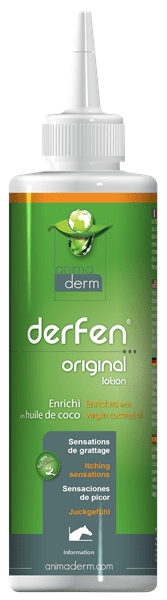 Derfen™ Original Lotion est le plus ancien des produits de la gamme Animaderm. Cela fait 14 ans qu’il soulage les chevaux sujets aux grattages. Derfen™ Original Lotion est composé d’huiles sèches ultra calmantes qui n’engorgent pas les peaux fines.