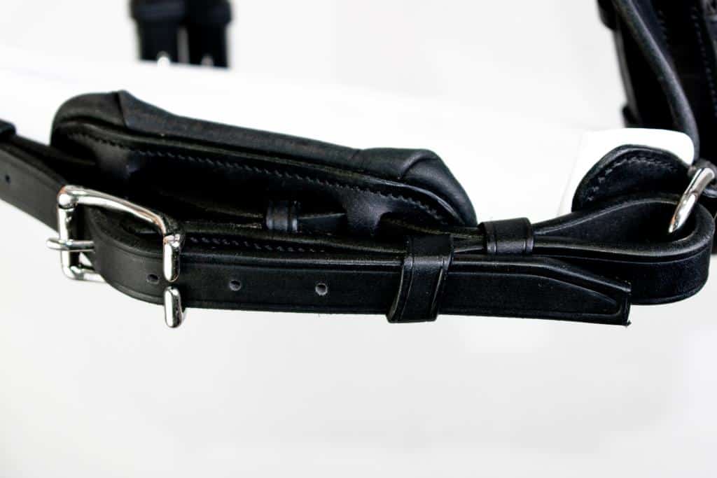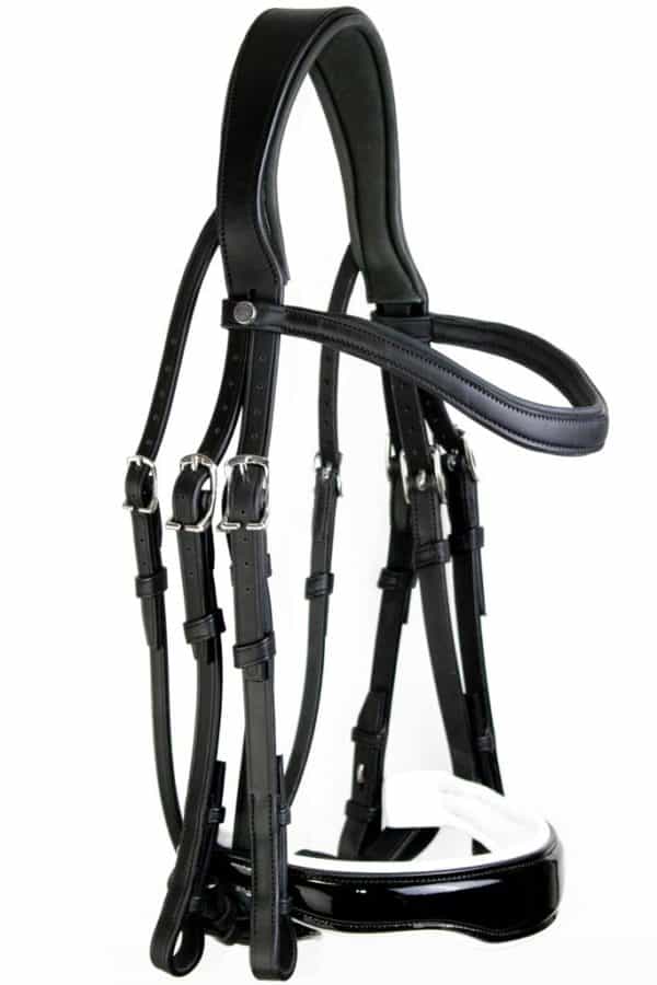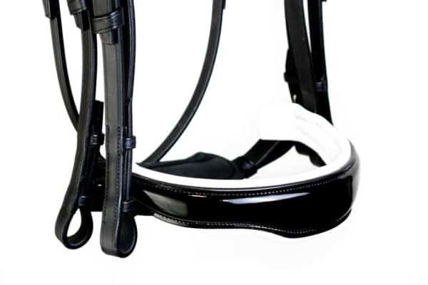 Le cuir vernis sur la muserolle et le padding blanc correspondent aux codes esthétiques de l’univers du dressage en compétition.