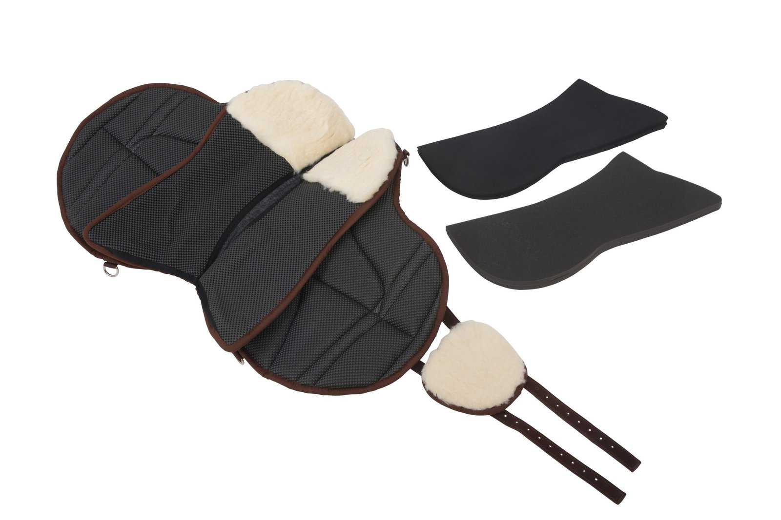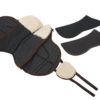 Il dispose d’un sanglage en V qui distribue la pression sur tout le tapis par des lanières intégrées. Nous avons renoncé volontairement à une possibilité de fixation d’étriers, puisque la position debout dans les étriers induirait également une pression ponctuelle. Le tapis est capitonné avec une mousse très dense d’épaisseur variable, il ne tourne pas grâce à son dessous en Sympanova. Le dessus en microfibre offre au cavalier une bonne accroche même aux allures vives.