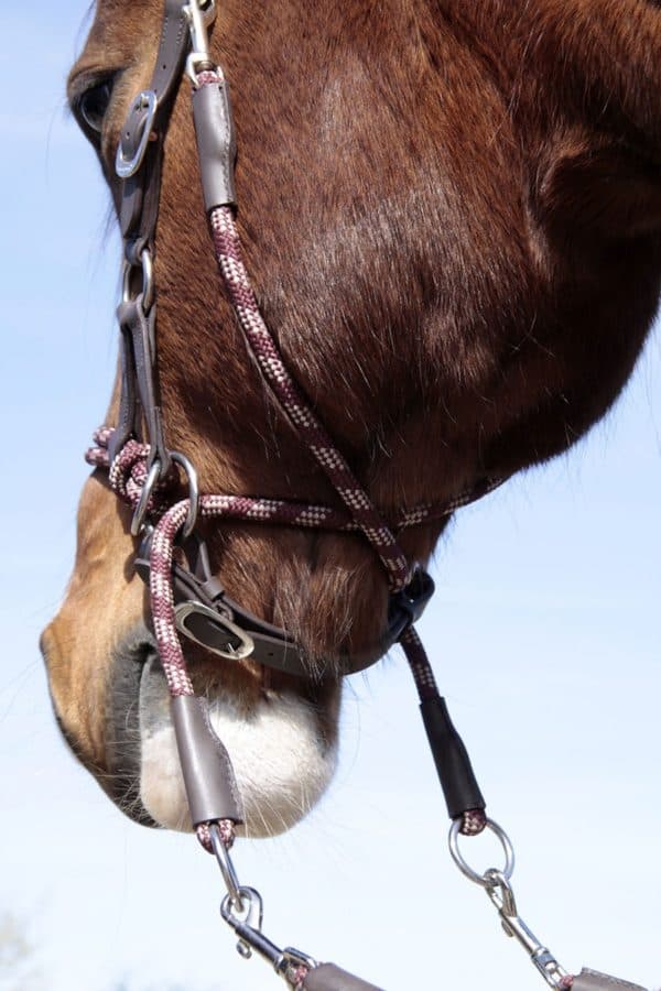 Notre Bridon Syringa peut être utilisé sans mors en tant que side-pull ou en tant que Bitless-Bridle avec des rênes croisées.