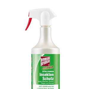 BREMSENBREMSE® classic repousse de manière fiable et durable les insectes gênants (taons, tiques, mouches noires, mouches, etc.). Parfum boisé caractéristique grâce au mélange d’huiles essentielles. Effet répulsif extra fort grâce à la combinaison du géraniol et du répulsif à insectes à large spectre IR3535®, éprouvé depuis 40 ans. BREMSENBREMSE® classic est sans alcool, ne déteint pas et peut bien sûr être utilisé en compétition.