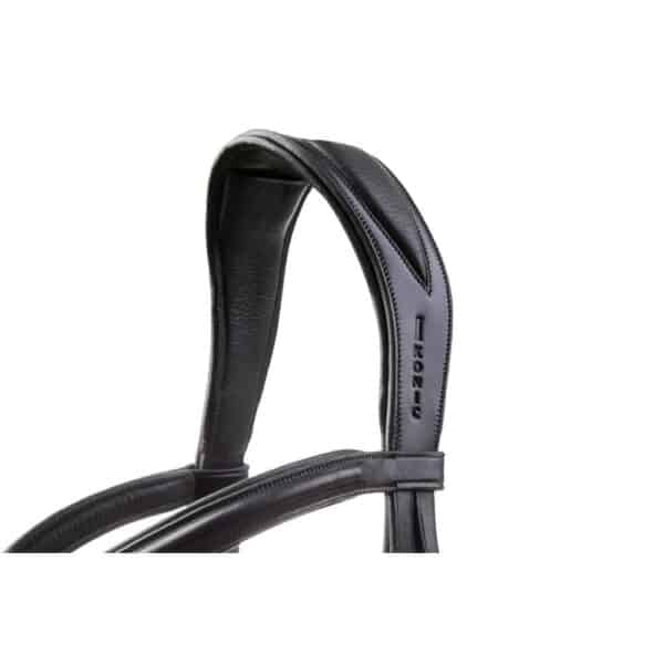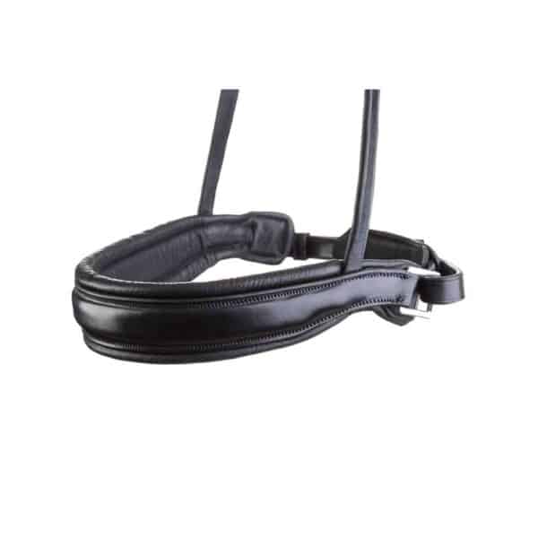 La têtière anatomique supprime la pression sur le dessus de tête et la muserolle est doublée pour plus de confort. Un large pullback à l’arrière assure un maintien parfait de la muserolle.