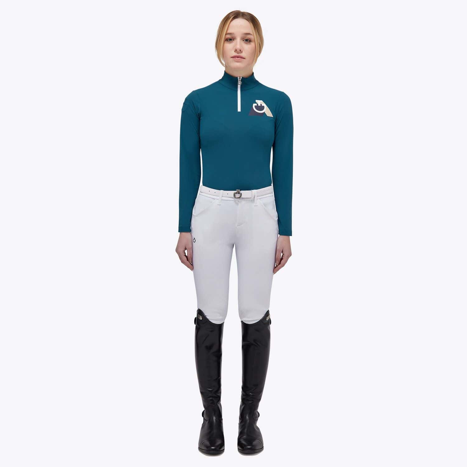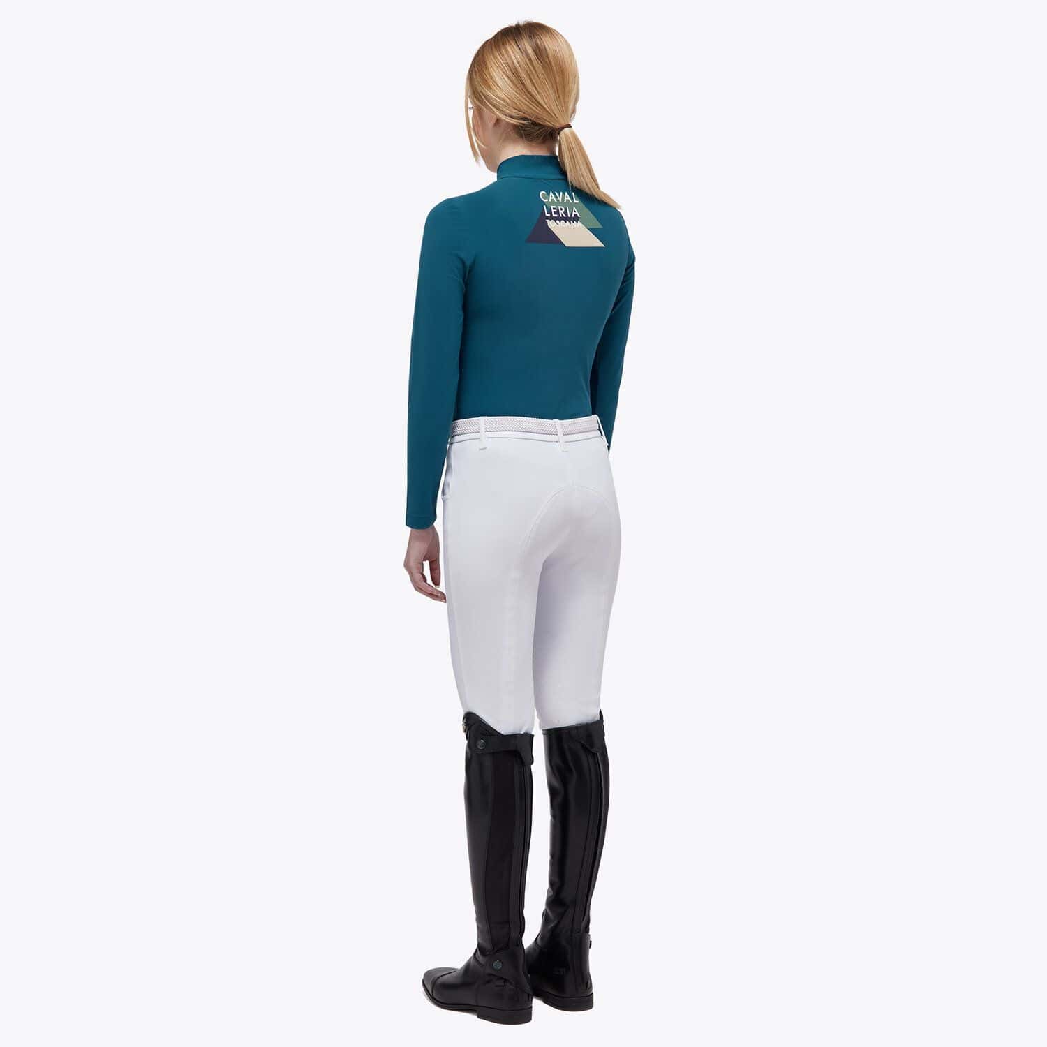 Cette chemise est conçue pour l’entraînement et apporte une touche originale à la tenue des jeunes cavalières. Dotée d’une coupe cintrée polyvalente, elle présente des manches longues pour une liberté de mouvement maximale, un col montant et un quart de fermeture éclair agrémenté d’une tirette en forme de logo CT. Le tissu performance jersey est durable, doux et offre une excellente respirabilité. La poitrine et le dos sont imprimés aux couleurs vives de l’équipe Cavalleria Toscana.