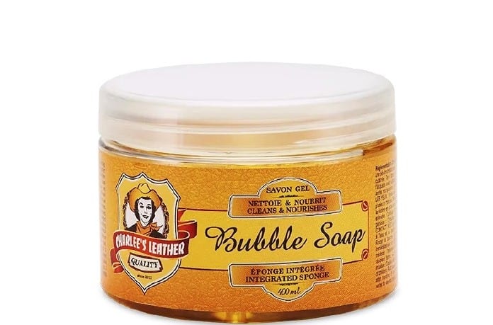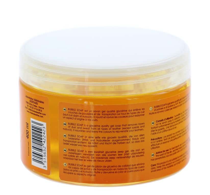 » savon gel révolutionnaire ! BUBBLE SOAP est un savon gel de qualité, sans glycérine pour une protection optimale des coutures, qui enlève les couches de poussière et de transpiration sur tous types de cuir (sauf cuir daim, nubuck, aniline). Il nourrit et ravive les couleurs pour redonner un aspect d’origine à vos cuirs. Conseils d’utilisation : passer l’éponge sur le savon jusqu’à obtention d’une mousse. Appliquer en frottant uniformément sur le matériel à nettoyer. Rincer l’éponge et ôter le superflu. Une fois le savon pénétré, frotter et lustrer à l’aide d’un chiffon doux et sec. Effectuer un essai préalable sur une partie cachée du matériel »