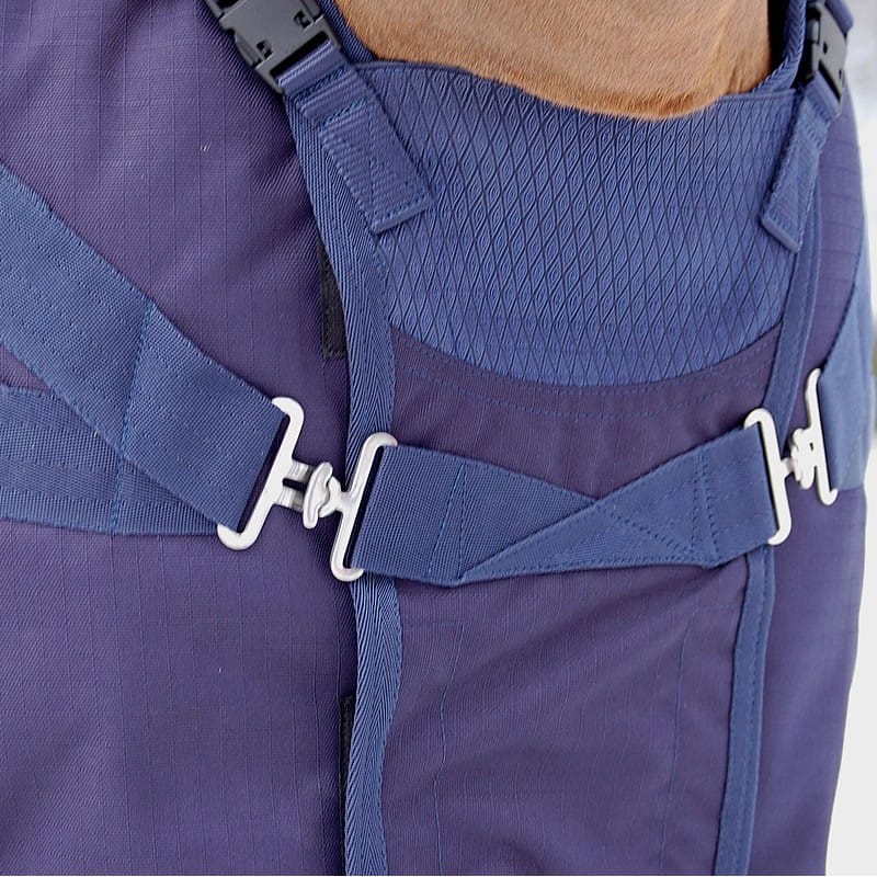Fermeture frontale par un patch amovible avec large partie supérieure élastique, maintenu de chaque côté par une boucle en acier et des sangles en nylon réglables