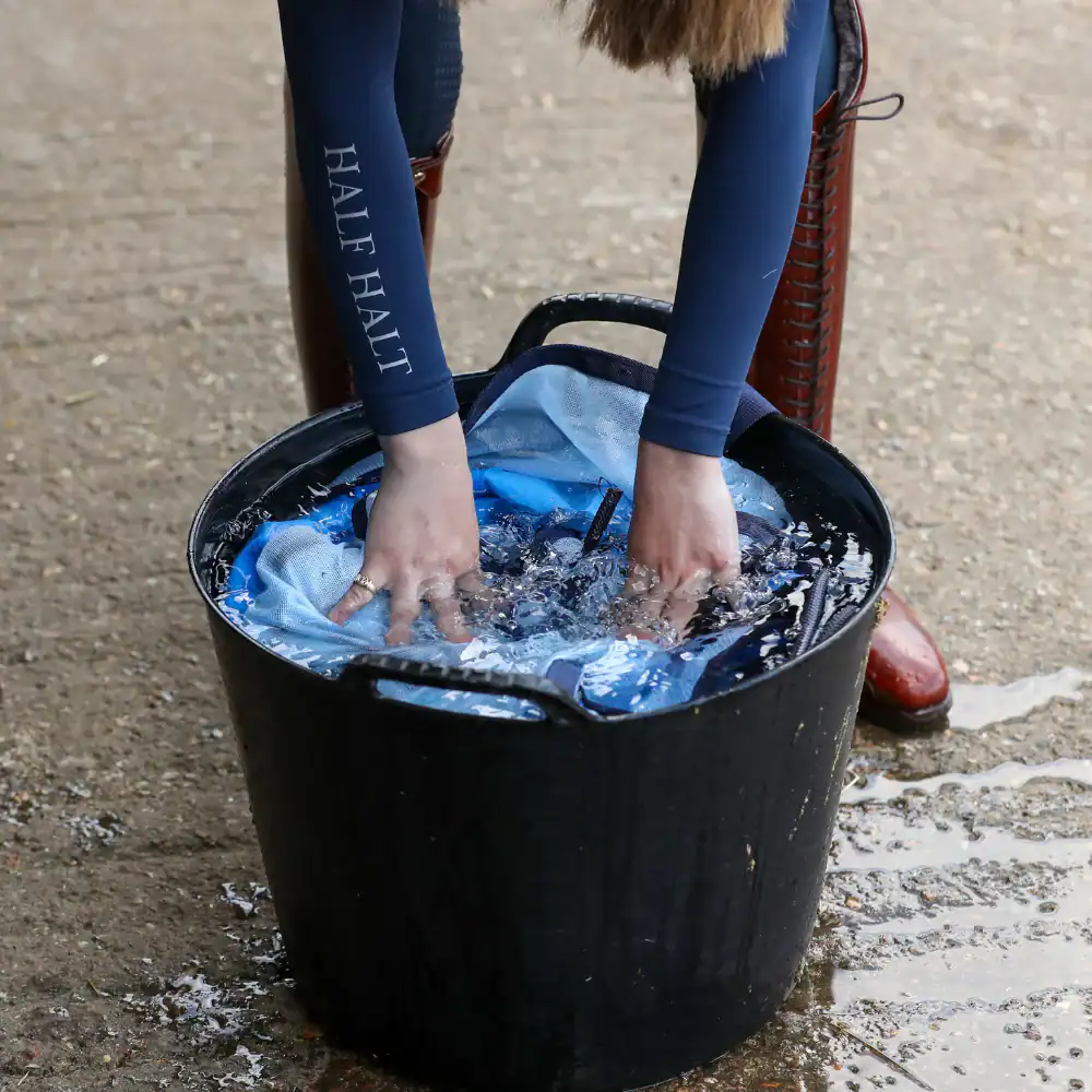 Le tapis doit être entièrement immergé dans un seau d’eau ou complètement trempé. Une fois sortie du seau, essorez l’excédent d’eau et placez-la sur le cheval. L’eau stockée dans le tissu est essentielle au processus de refroidissement, mais comme elle est retenue dans le tissu, votre cheval ne sera pas trempé.