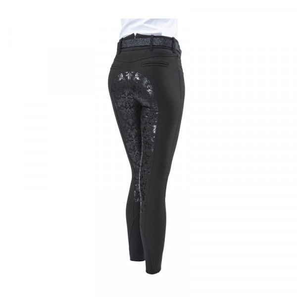 Le pantalon d’équitation Equiline X-grip Giada est un pantalon élégant en matière Schoeller extensible de la marque italienne Equiline ! Le X-grip Equiline vous offre une excellente adhérence en selle. Ce pantalon Equiline ultra-stylé présente une taille haute avec une encoche en V à l’arrière, ainsi que des détails élégants en argent pailleté avec un X-grip transparent orné d’un magnifique motif floral.