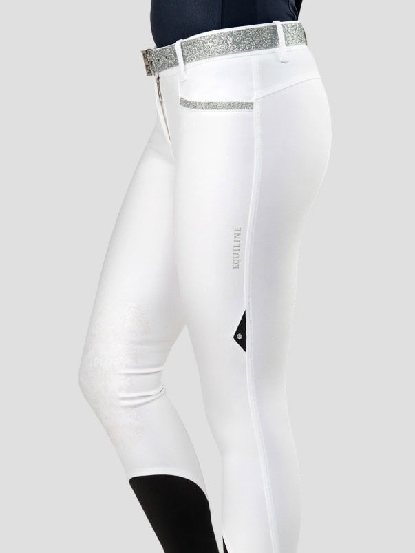 Les empiècements X-Grip au motif baroque, judicieusement placés au niveau des genoux, offrent une stabilité supplémentaire en selle, tandis que les bas de jambe à fermeture extensible minimisent le volume autour des mollets sous les bottes d’équitation longues.