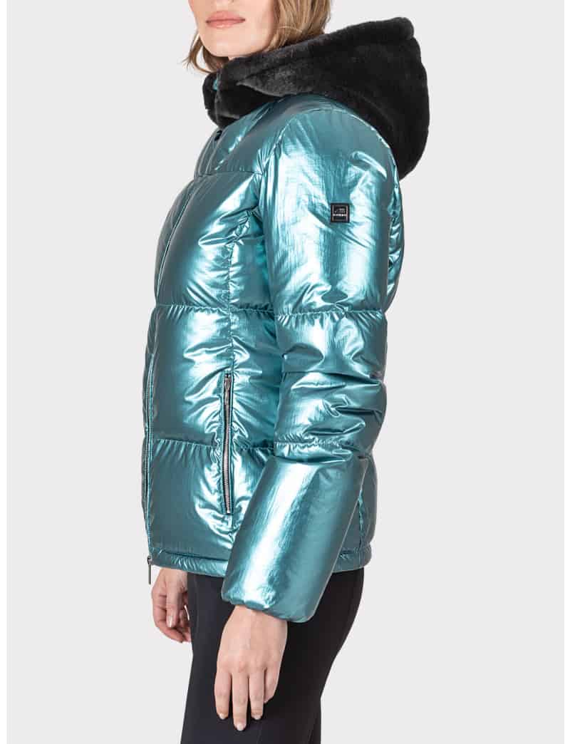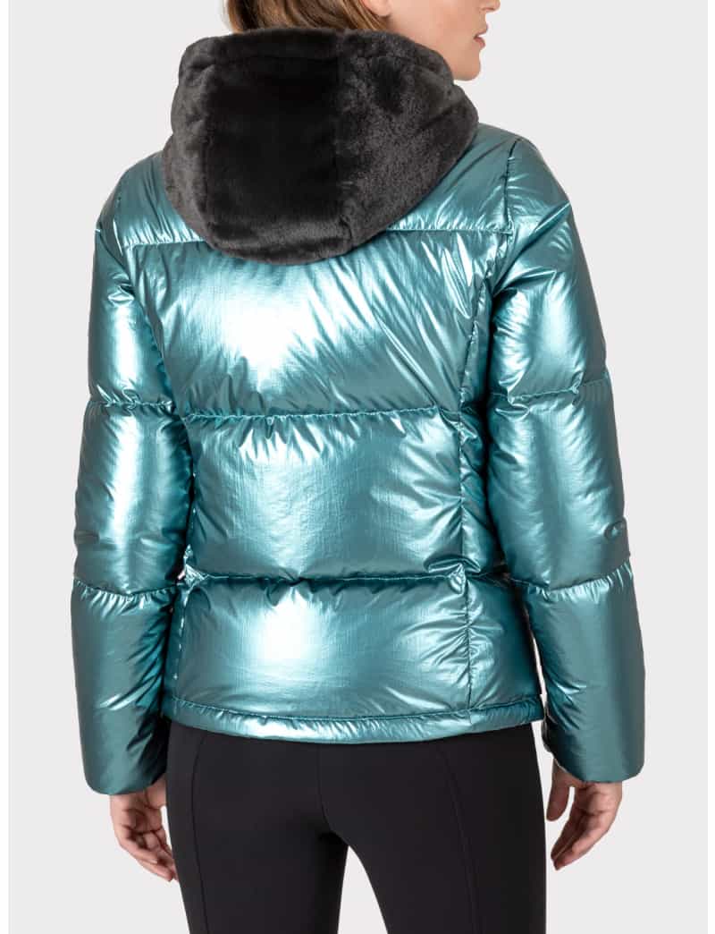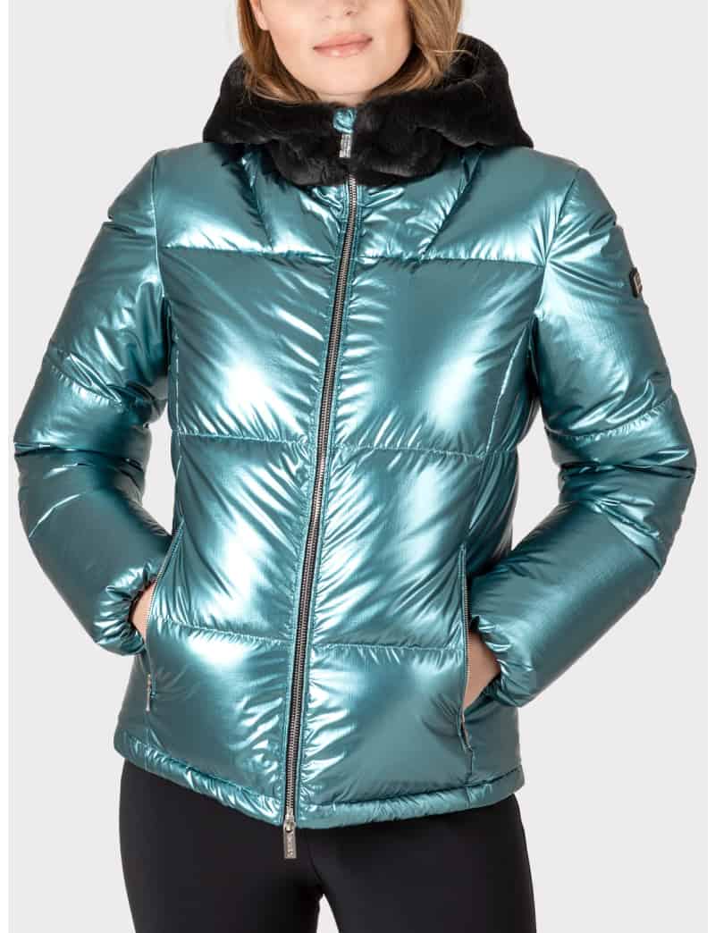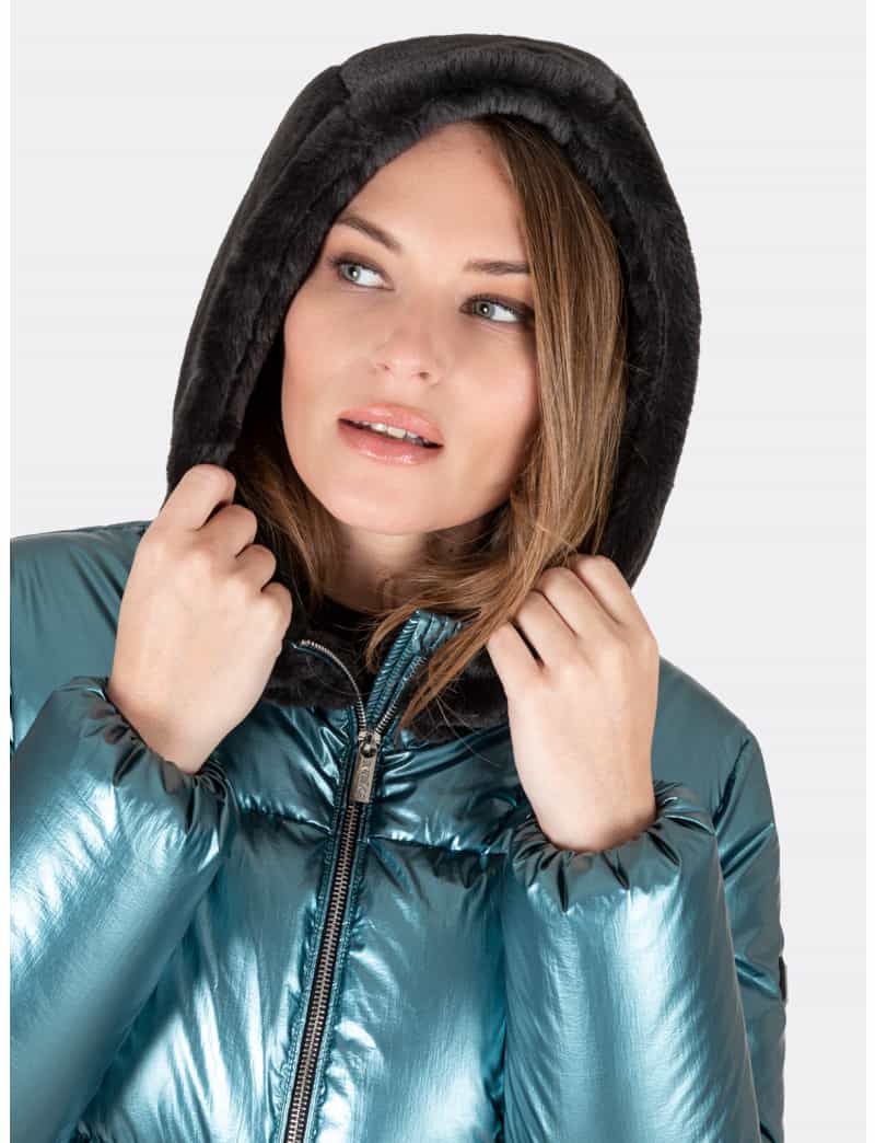 Veste en duvet vert scarabée pour femmes avec rembourrage en plumes, ultra chaude et confortable. Capuche douce en fausse fourrure, fermeture éclair centrale à double curseur et 2 poches zippées.