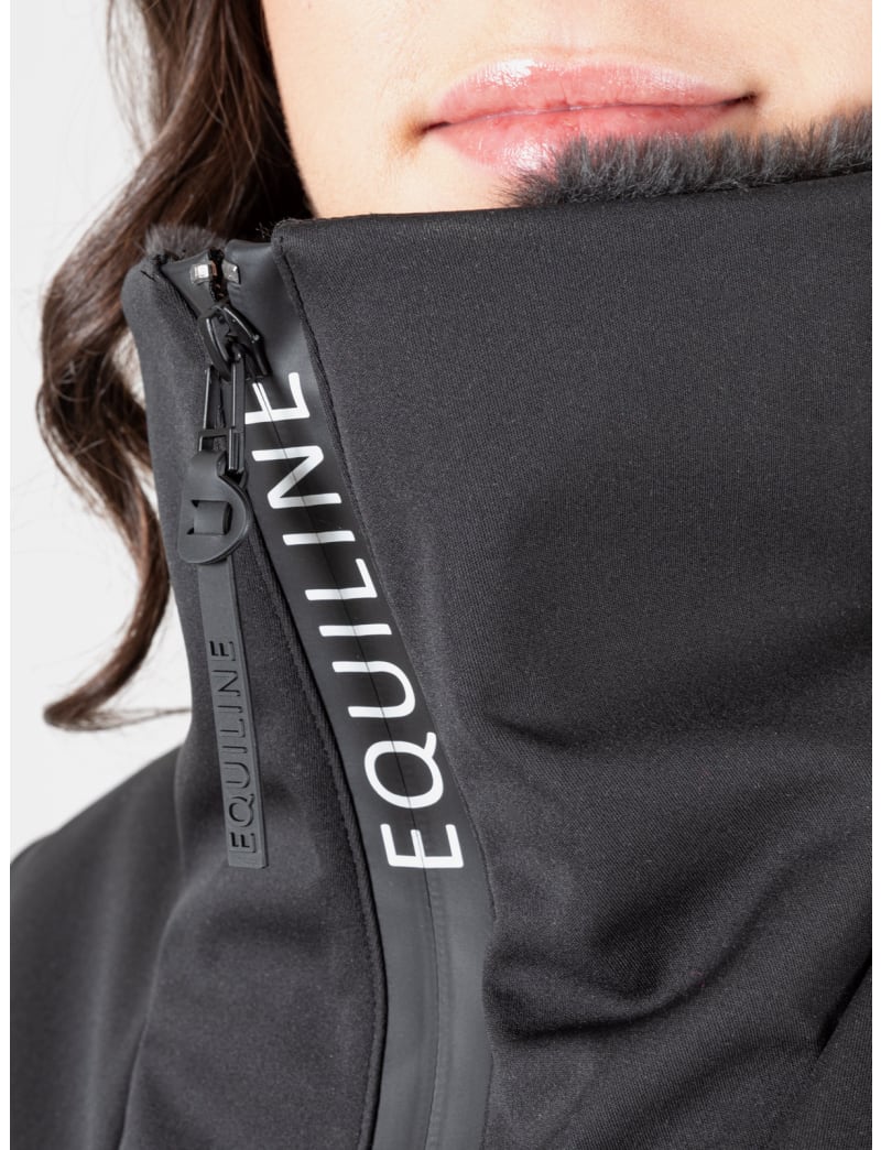 Veste softshell noire avec fausse fourrure pour femmes, extensible et hautement respirante. Douce, confortable et chaude grâce à sa doublure intérieure en fausse fourrure. Logo lettre Equiline sur la fermeture éclaire centrale caoutchoutée et 2 poches zippées.