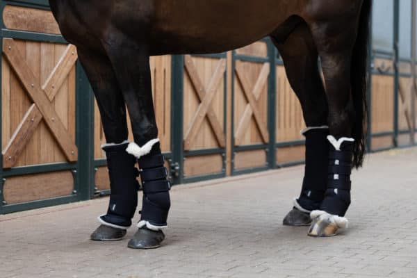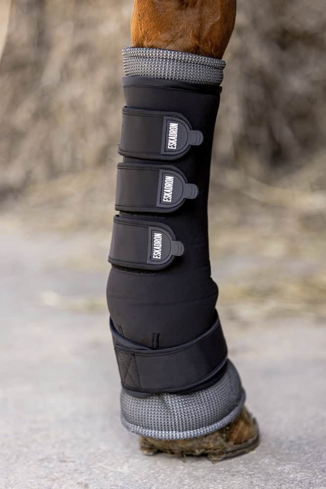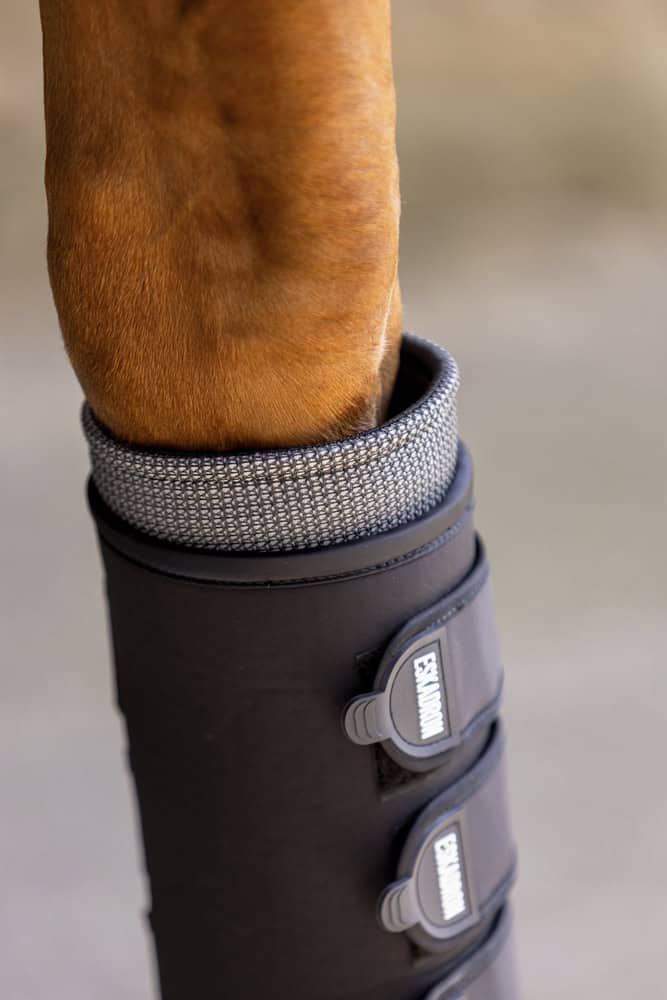 néoprène perforé respirant doublure en mesh remplaçable quatre fermetures velcro robustes adaptable individuellement à la jambe du cheval forme anatomique par paire