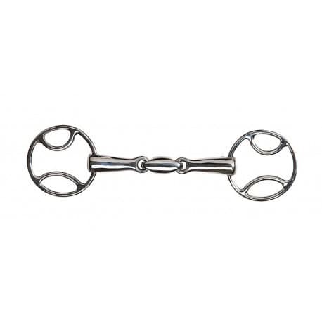 En inox, avec double brisure anatomique. Gros canons, anneaux à passes pour les montants et les rênes. Les passes permettent la fixité du mors dans la bouche et une action plus directe.