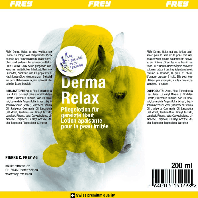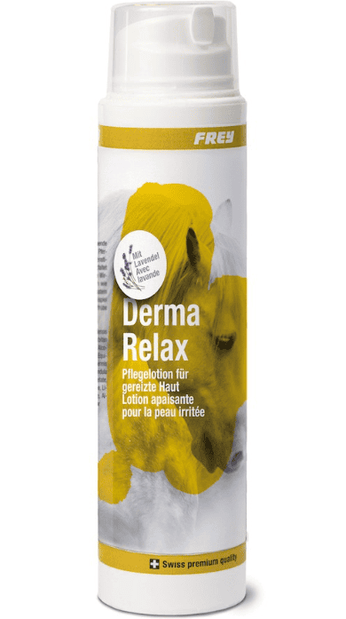 FREY Derma Relax est une lotion apaisante pour le soin de la peau abîmée des chevaux. En cas d’eczéma estival, de piqûres d’insectes et d’autres irritations, FREY Derma Relax déploie son effet nourrissant grâce à des ingrédients naturels tels que la lavande, la prêle et l’huile d’onagre pressée à froid. À appliquer par exemple sur la crinière, la queue ou le ventre.