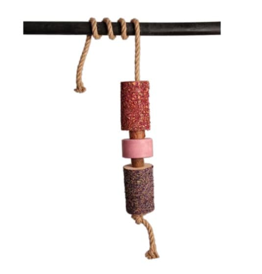 INGRÉDIENTS : bâtons de bouleau, bâtons de pin, pétales de rose sauvage, mauve, pierre à lécher avec lavande (chlorure de sodium, phosphate dicacique, carbonate de calcium, oxyde de magnésium, huiles essentielles de lavande), huiles essentielles (lavande, eucalyptus, menthe poivrée, citron), miel, eau, corde de coton