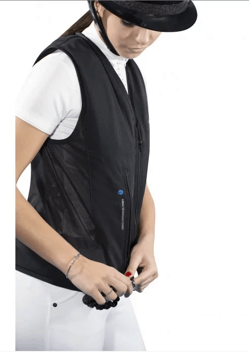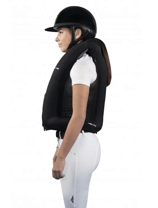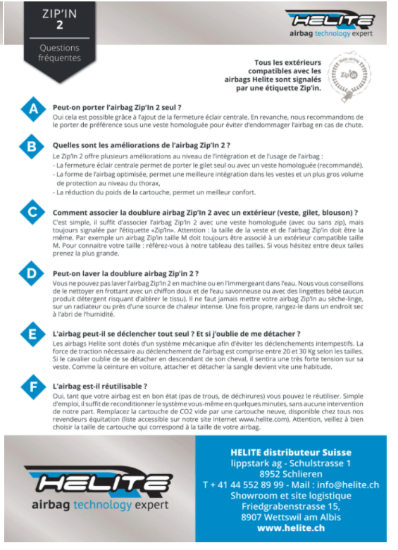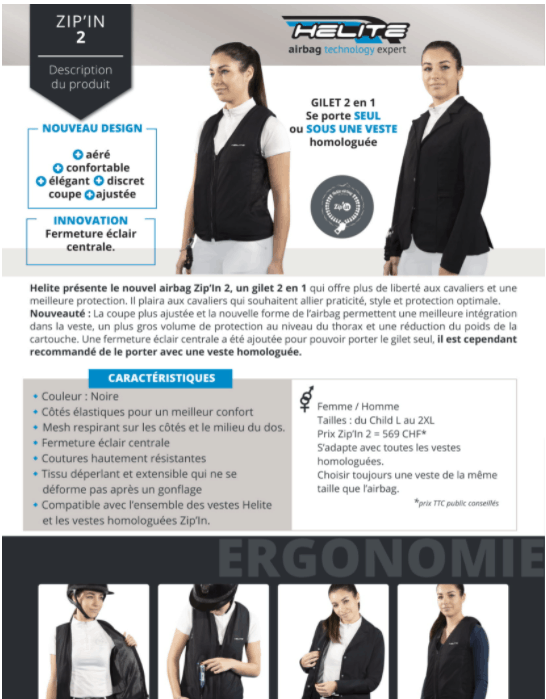 Helite présente le nouvel airbag Zip’In 2, un gilet 2 en 1 qui offre plus de liberté aux cavaliers et und meilleur protection. Nouveauté: La coupe plus ajustée et la nouvelle forme de l’airbag permettent une meilleur intégration dans la veste, un plus gros volume de protection au niveau du thorax et une réduction du poids de la cartouche. Une fermeture éclair centrale a été ajoutée pour pouvoir porter le gilet seul, il est cependant recommandé de le porter avec une veste homologuée.