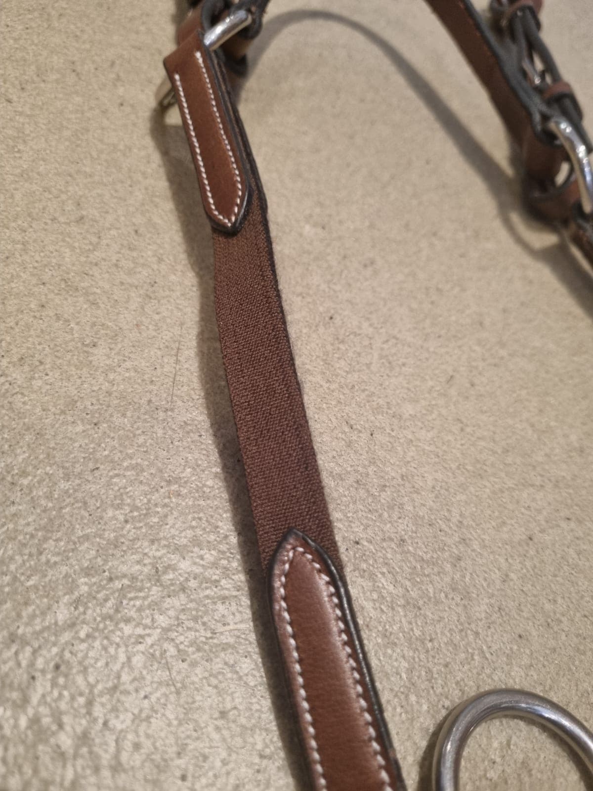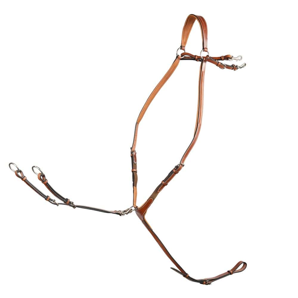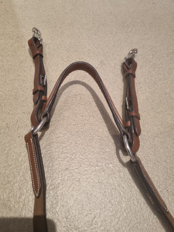 Le collier de chasse Horse In avec élastique pour un ajustement optimal + fourche de martingale. Vendu soldé car le cuir aurait besoin d’un bon graissage.