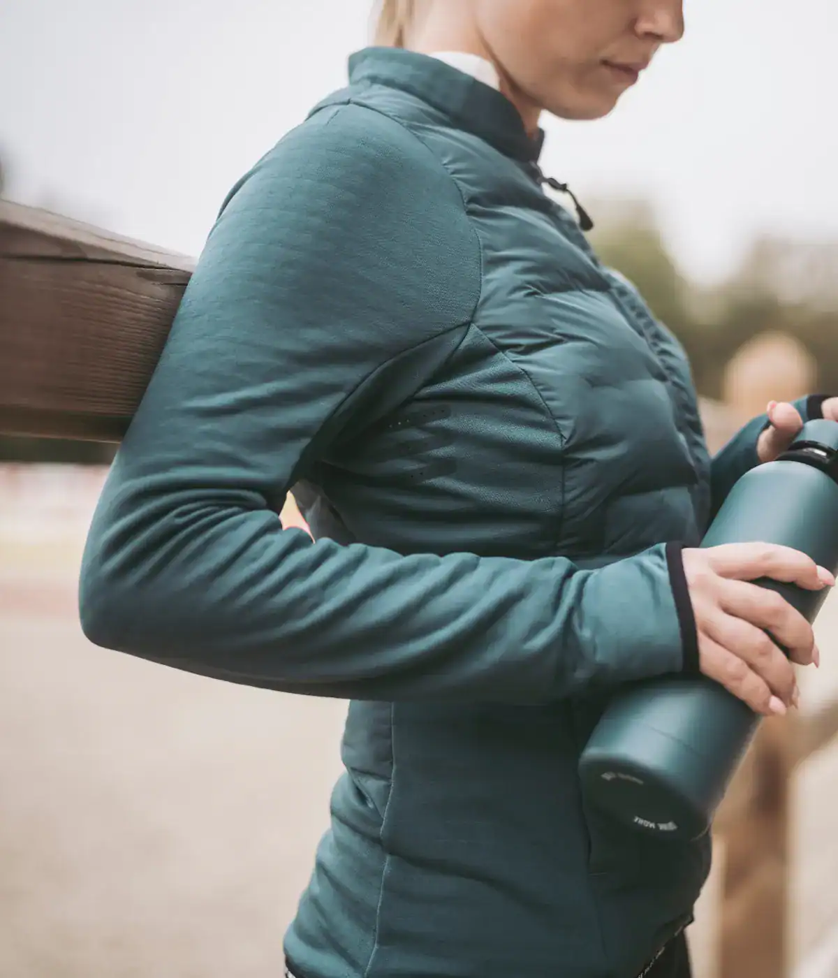 Pour s’adapter aux variations de température et à l’intensité d’effort en équitation, nous avons développé la Storm : une veste hybride thermo-régulante qui tient chaud sans risque d’hyperthermie dûe à l’effort. Légère, elle peut se porter seule par dessus un tee-shirt par temps chaud, ou sous une veste de protection par temps humide et froid. La combinaison de différentes matières répond aux besoins thermiques des cavaliers par zone. Les panneaux matelassés thermocollés en duvet-polyester apportent de la chaleur sur le thorax, le ventre et le dos et protège du vent. Les panneaux en maille acordéon légère et très stretch sur les bras, les épaules et les côtés évacuent efficacement l’humidité du corps et assurent une grande liberté de mouvement. Les micro-perforations sous les bras et sur les côtés favorisent la circulation de l’air pendant l’effort.