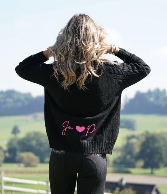 Ce pull noir, à la fois chic et moderne à la coupe longue, se distingue par ses inscriptions « Ju et Pa » dans le bas du dos, en rose fluo pour une touche de féminité discrète. Confectionné avec des bords-côtes, il garantit une coupe structurée et un confort optimal. Sa taille unique s’adapte à toutes les morphologies, pour un look élégant et raffiné.