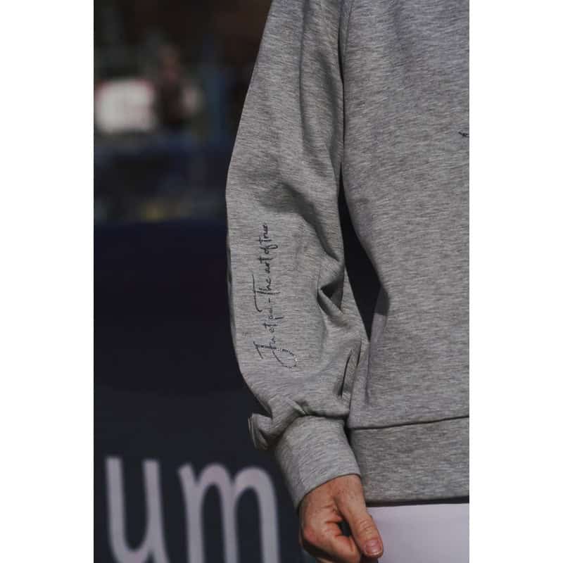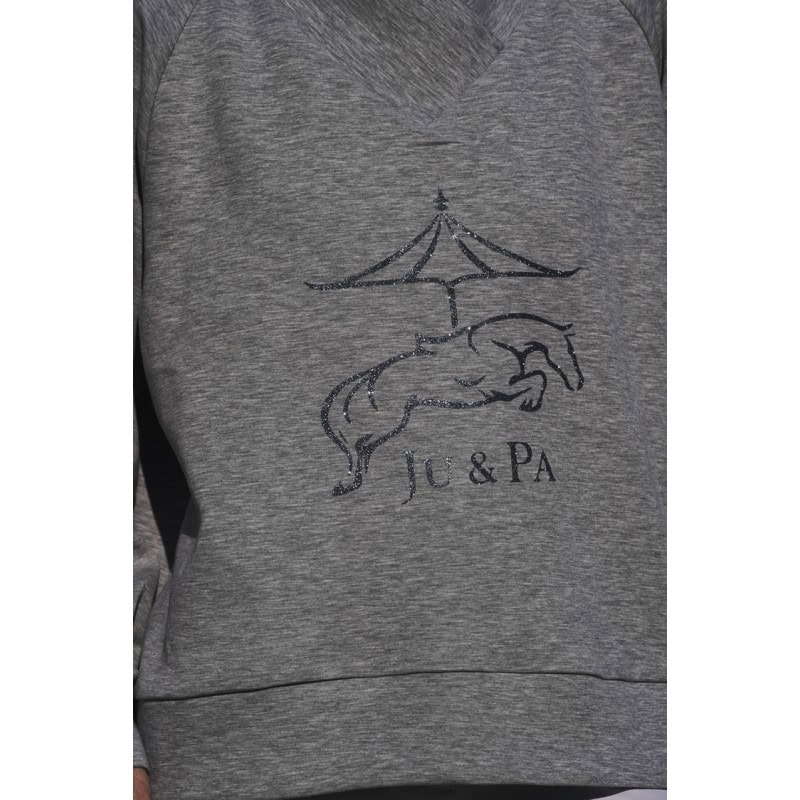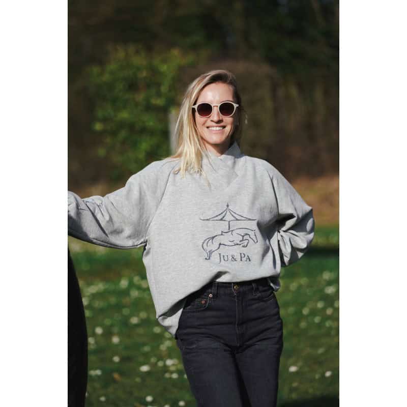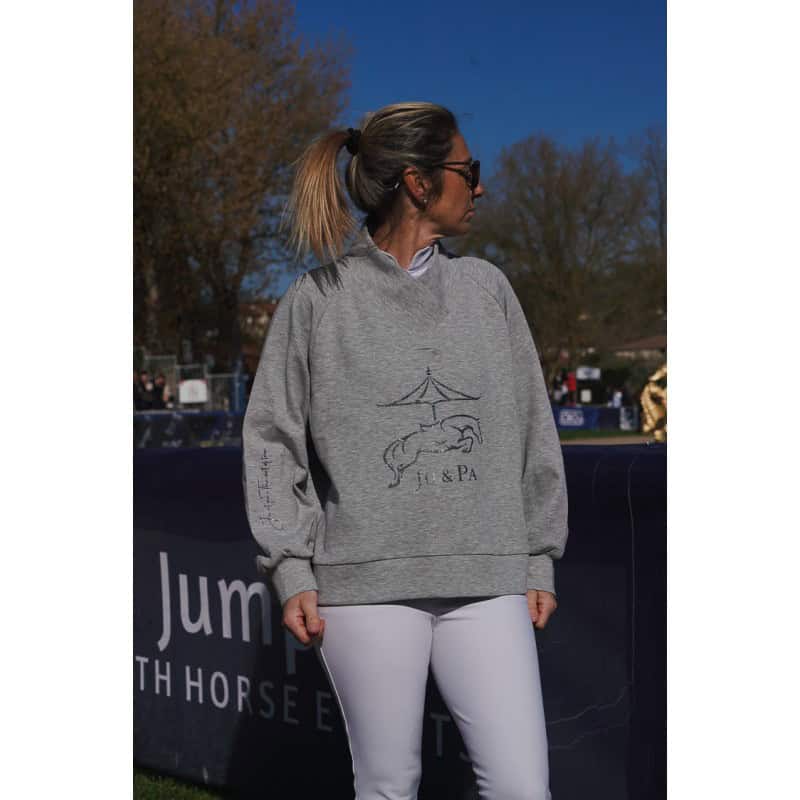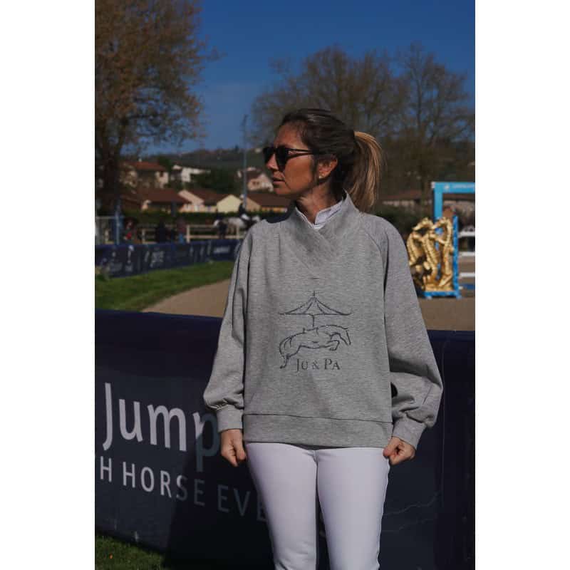 Sweat gris au col au design original, alliant confort et style moderne. Le devant est décoré d’un logo en argent foncé, apportant une touche élégante et discrète.