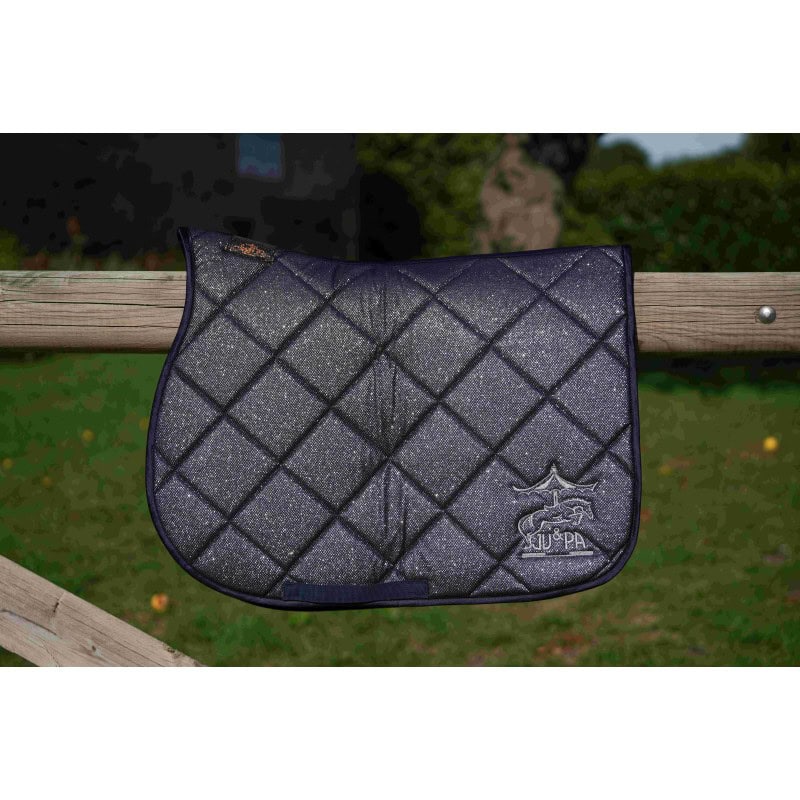 Offrez à votre cheval confort et style avec ce superbe tapis de selle. Le fond est un glitter multicolore ou noir recouvert d’une maille ajourée élastique, les bord sont en satin. Confectionné dans un tissu de haute qualité, il offre un rembourrage optimal pour protéger le dos de votre cheval. Le design matelassé en losanges ajoute une touche élégante, tandis que le logo brodé donne un aspect raffiné et unique. Parfait pour un usage quotidien ou en compétition. Ce tapis est conçu pour s’adapter à toutes les selles, garantissant une stabilité et un confort maximal.