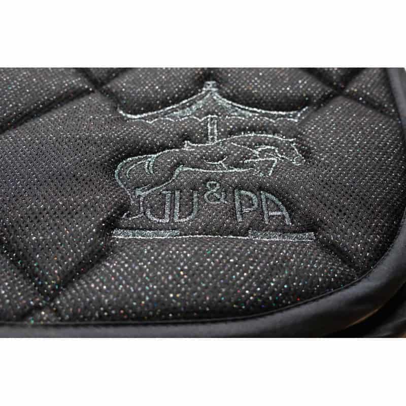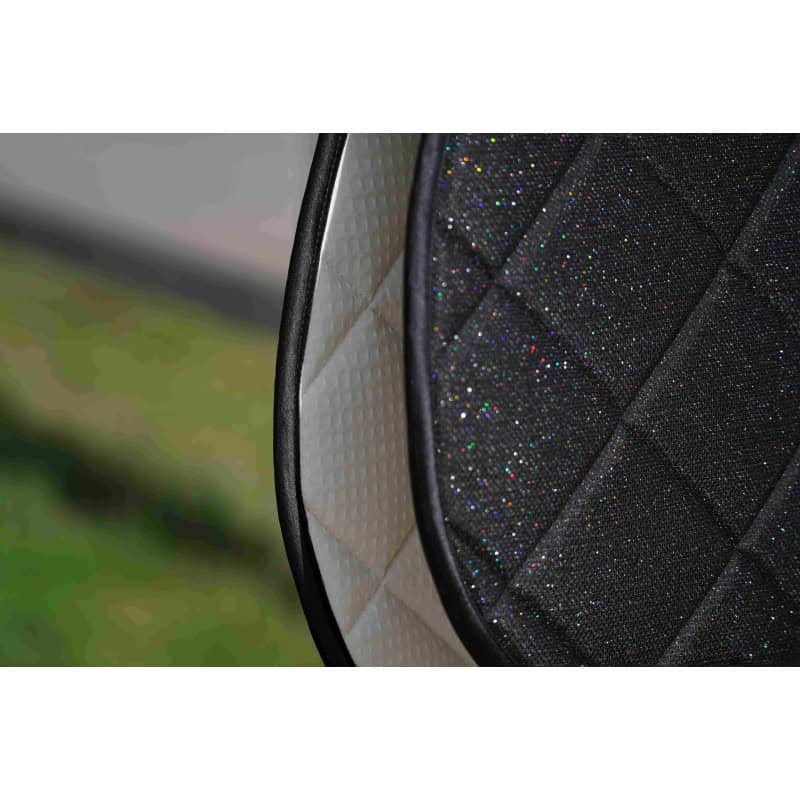 Offrez à votre cheval confort et style avec ce superbe tapis de selle. Le fond est un glitter multicolore ou noir recouvert d’une maille ajourée élastique, les bord sont en satin. Confectionné dans un tissu de haute qualité, il offre un rembourrage optimal pour protéger le dos de votre cheval. Le design matelassé en losanges ajoute une touche élégante, tandis que le logo brodé donne un aspect raffiné et unique. Parfait pour un usage quotidien ou en compétition. Ce tapis est conçu pour s’adapter à toutes les selles, garantissant une stabilité et un confort maximal.