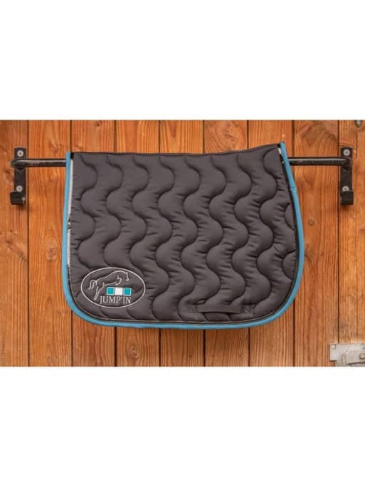 Tapis de selle matelassé en vague et doublé d’un nid d’abeille  bien épais pour apporter du confort au cheval. Le tapis de selle Jump’in a une ligne de dos qui permet un dégarrotage optimal, il est doté de deux passants de sangle pour garder la selle en place et de deux broderies de saison aux couleurs de Jump’in.
