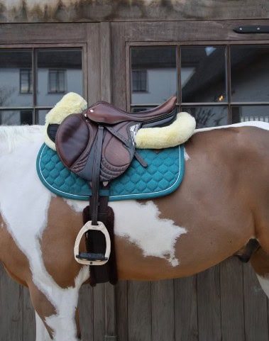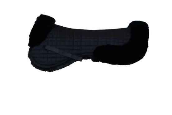 Doté d’une forme ergonomique, ce tapis s’adapte parfaitement sous la plupart des selles. Disponible en taille standard pour convenir aux selles de saut d’obstacles et de dressage. Grâce à son épaisseur de 10mm, le cavalier se sentira près du cheval. Coloris disponibles : laine de mouton naturelle ou noire. Si vous souhaitez le mouton sur le dessus, veuillez prévoir un chevauchement de 3 cm par section lors de la mesure de la longueur correcte A-B (par exemple, si vous voulez de la peau de mouton à l’avant et à l’arrière et que votre tapis mesure 58 cm de long, déduisez 6 cm, donc 52 cm est l’espace disponible pour votre selle).