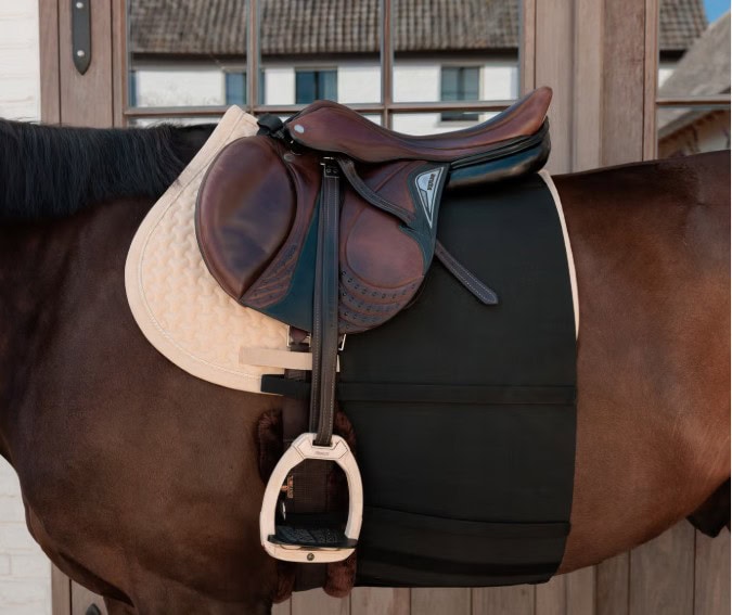 Contrairement aux modèles standards, ce Belly Band présente une forme plus large de 35cm, couvrant une plus grande surface du ventre pour une protection renforcée et moins de risques de contact avec la jambe du cavalier. Grâce à son tissu élastique et résistant, il suit les mouvements de votre cheval tout en restant bien en place. Le panneau en néoprène doux amortit la pression et réduit les frottements – idéal pour les chevaux sensibles, même en cas de séances intensives ou longues balades.