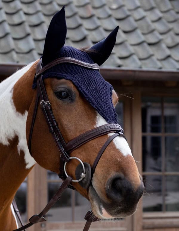 La matière autour des oreilles est extensible et ajustée. La partie du cou est plus longue pour éviter que le voile ne glisse. La partie avant, également allongée, s’attache facilement à la muserolle grâce à une boucle. Disponible en noir, bleu marine et marron.