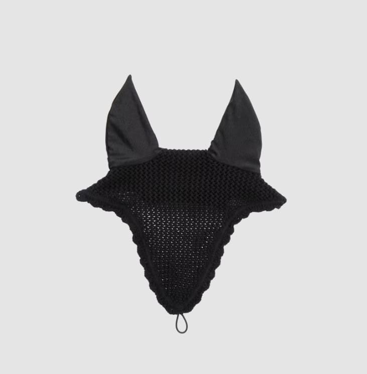 La matière autour des oreilles est extensible et ajustée. La partie du cou est plus longue pour éviter que le voile ne glisse. La partie avant, également allongée, s’attache facilement à la muserolle grâce à une boucle. Disponible en noir, bleu marine et marron.