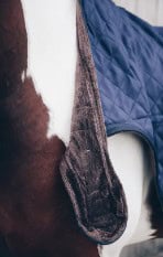 Cette couverture de marcheur a un garnissage de 160g et est idéale pour longer les chevaux ou pour les mettre dans le marcheur quand il fait froid. L’intérieur en peau de lapin artificielle offre davantage de chaleur car elle crée de minuscules poches d’air qui retiennent la chaleur corporelle du cheval. Elle offre également plus de confort, fait briller le poil de votre cheval et aide à prévenir les frottements. Les épaules sont libres et la fermeture au poitrail se compose d’une boucle classique combinée à une fermeture Velcro. Le garrot est protégé par du mouton synthétique. La couverture de marcheur est dotée de deux sur-sangles sous le ventre pour la garder bien place ainsi que d’une courroie de queue en nylon attachée à deux anneaux en D. Elle a un look très chic grâce au motif diamant et aux élégantes finition en similicuir. Elle est lavable en machine à 30 °, pas de sèche-linge.