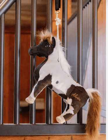 Une petite corde est attachée au garrot pour pouvoir attacher le jouet dans le box. Comme le jouet est vraiment destiné à jouer et à s’amuser, il est possible que votre cheval le déchire. Le jouet sont remplis de jute, ils peuvent donc aussi être écrasés sans perdre leur forme.
