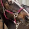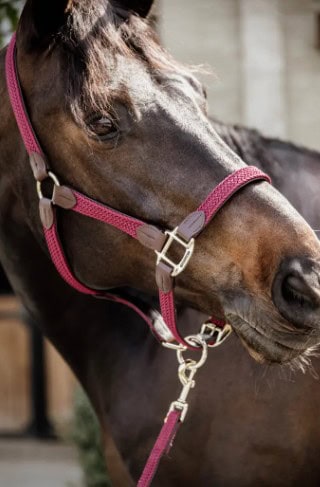 Le Plaited Nylon Halter est fait de similicuir (100% respectueux des animaux). Ce cuir est recouvert de nylon tressé. Toutes les fermetures sont de couleur or et sont donc parfaitement assorties à nos longes.