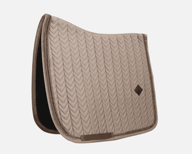 L’extérieur du tapis de selle est fabriqué à partir de notre célèbre et doux tissu velvet surpiqué en « Fishbone ». Le passepoil est terminé par des perles très chics. La doublure du tapis de selle est un mélange de coton et de polyester qui absorbe facilement la sueur et est très respirant.