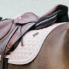 Le Tapis de Selle Corde Tressée n’a pas de sangles gênantes pour s’attacher à la selle. Pour rester en place sous la selle, l’intérieur du tapis est gaufré. Cette structure gaufrée sèche rapidement et offre un effet d’amortissement sous la selle.