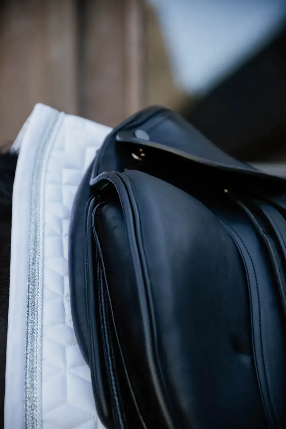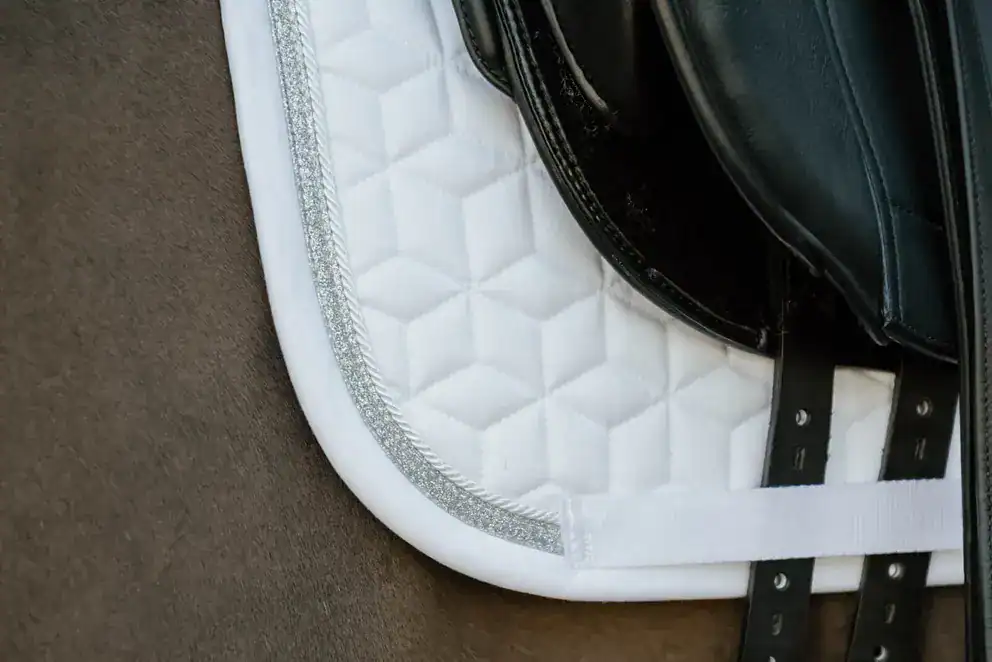 Ce tapis de selle possède un matelassage étoile unique ainsi qu’un liseré pailleté.