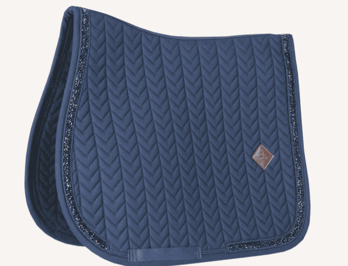 Ce tapis de selle possède un matelassage fishbone unique ainsi qu’un liseré en pierres scintillantes. Il comporte un logo en cuir subtil, tout en offrant suffisamment d’espace pour broder le tapis de selle si nécessaire.