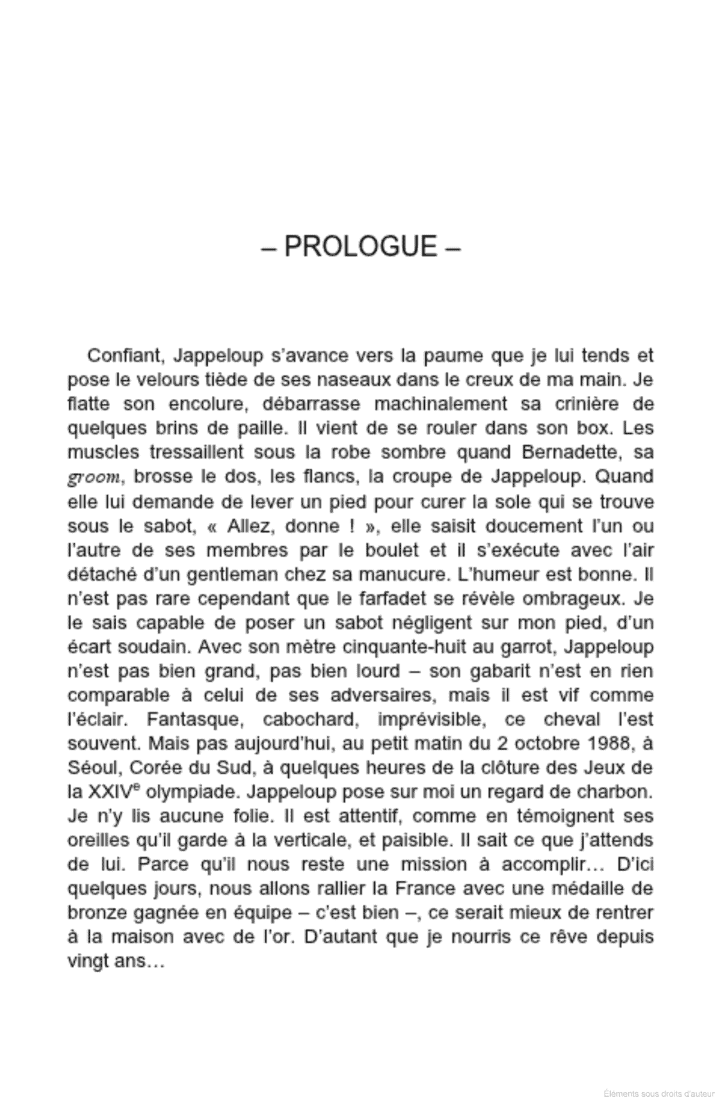 En 1988, aux jeux Olympiques de Séoul, les spectateurs retiennent leur souffle. Quatre ans plus tôt, Jappeloup, le célèbre et atypique petit cheval noir, avait mis à terre son cavalier, Pierre Durand, avant de s’enfuir vers les écuries. Mais cette fois, Jappeloup franchit tous les obstacles avec une générosité extraordinaire : la médaille d’or est pour lui… Vraiment pour lui, puisque, au pied du podium, Pierre Durand la lui passe autour de l’encolure.