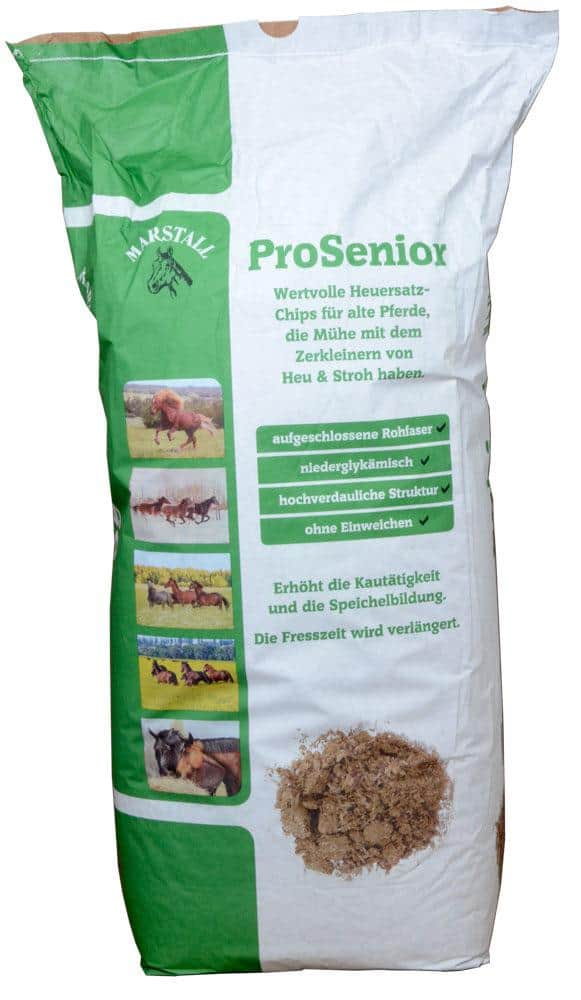Il existe d‘autres raisons d‘alimenter Prosenior. Fourrage riche en protéines, comme l‘herbe au printemps ou le foin peut être combiné avec le Prosenior, qui est pauvre en protéines et riche en fibres brutes peut être équilibré de manière optimale. Les mangeurs pressés reçoivent Prosenior ainsi que l‘aliment concentré mélangé, ils trouvent plus de repos en mangeant.