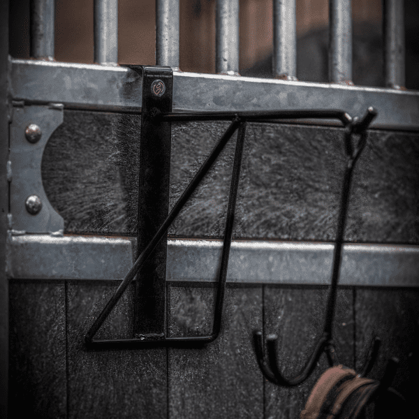 UN porte-crochet équestre en métal noir à combiner avec le crochet équestre ONE pour accrocher facilement plusieurs brides ou licols. Ou à utiliser séparément pour suspendre une seule bride ou un seul licol. 32 x 45 cm