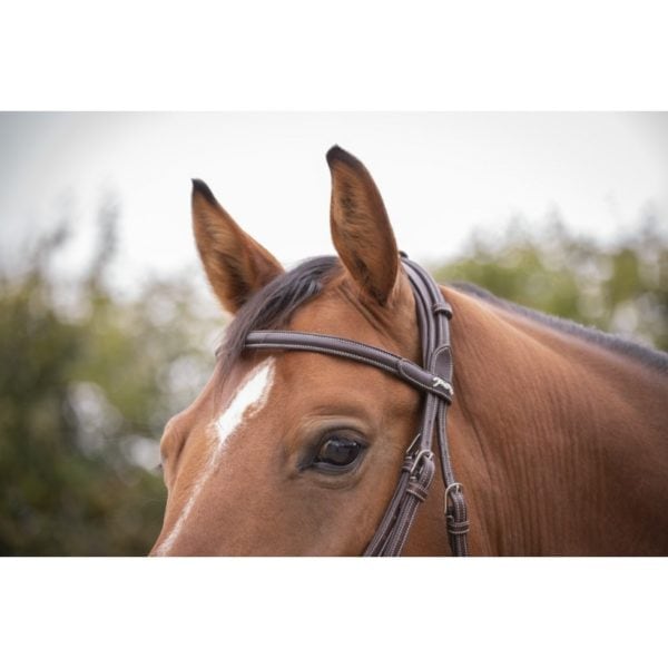 Bridon « Elégance » Pénélope orné de surpiqûre crème en contraste. Il est composé d’une muserolle large combinée doublée de cuir souple et d’une têtière anatomique doublée également de cuir souple sur la zone en contact avec la tête du cheval et, sur le dessus, d’un insert fin décoratif glissé dans des passants. Le pin’s Pénélope argenté est fixé à gauche sur le passants du frontal.