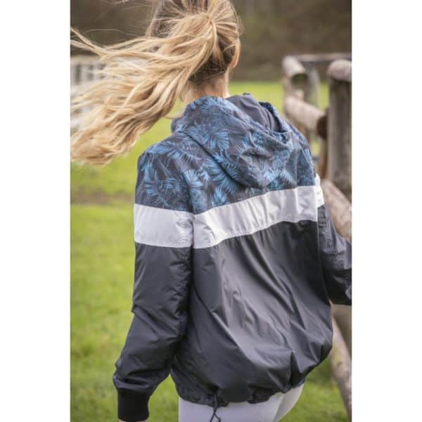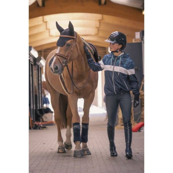 Le coupe-vent Celecce revient, cette saison en bleu canard pour nous aider à embellir les journées de printemps pluvieuses… Notre veste coupe-vent Celecce est confectionnée dans un tissu léger et très doux, très agréable à porter, il se porte aussi bien sur un jean que sur un pantalon d’équitation. Il se porte un peu loose car sa coupe n’est pas particulièrement cintrée, il conviendra donc à de nombreuses morphologies. Il est doté d’une capuche bien emboitante rehaussée d’un cordon blanc, de deux poches zippées et d’une fermeture Éclair sur le devant. Son look tricolore en bloc est particulièrement dans l’air du temps et on voit le logo de la marque brodé en blanc sur le cœur. On peut aussi noter un cordon de serrage sur le bas de la veste pour le porter en le faisant blouser.
