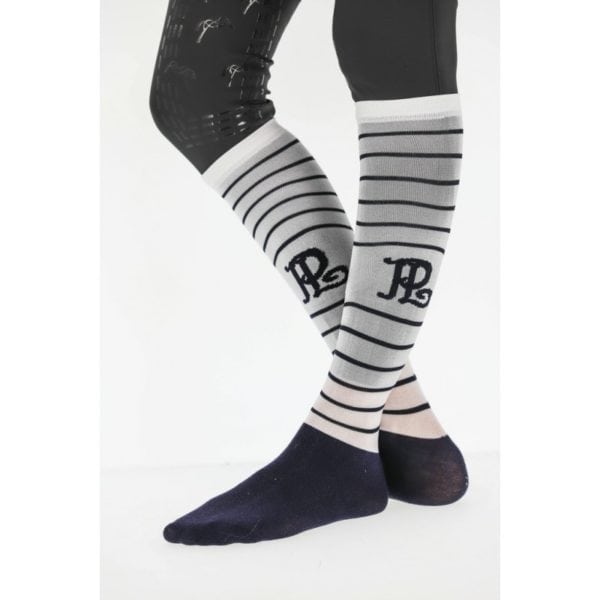 Chaussettes d’équitation Pénélope d’inspiration marinière. Sur le mollet, elles sont marines et blanches et comportent également le monogramme PL. La zone du pied est marine unie. Elles sont très extensibles et donc confortables. Elles sont également très proches du mollet ce qui leur permet de bien se glisser sous les bottes d’équitation et sous les mini-chaps. En ville, elles apportent une touche d’originalité à vos looks équestres.
