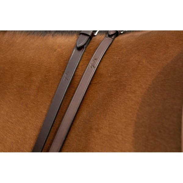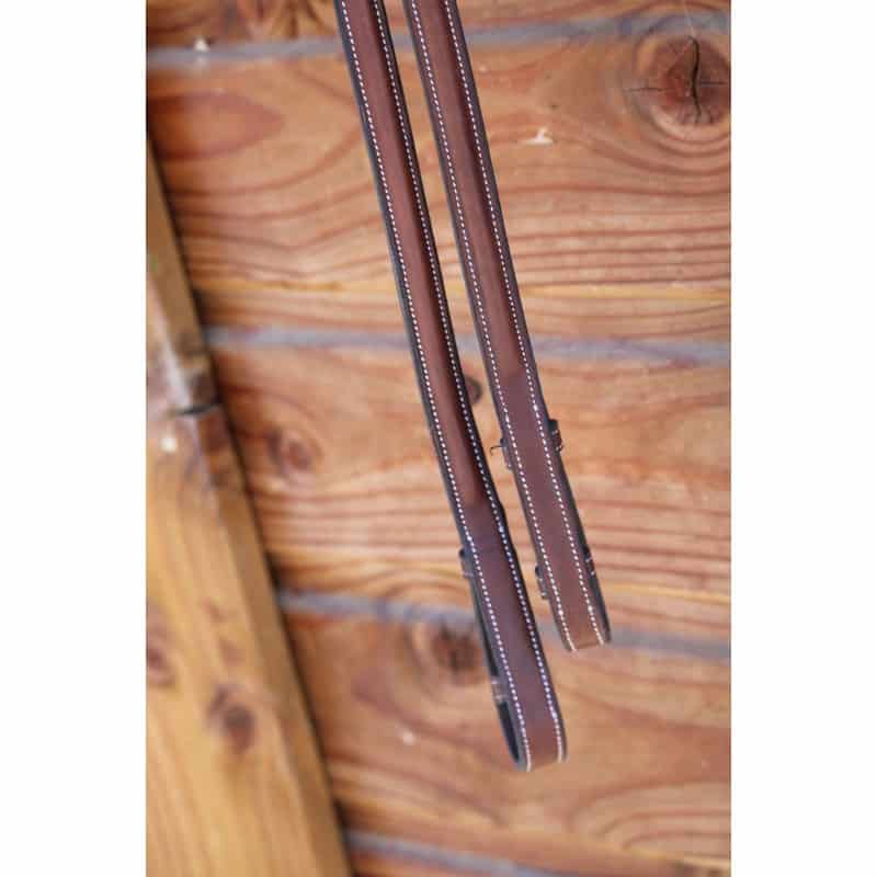 Rênes caoutchouc assorties au bridon « Luxe ». Elles sont en cuir recouvertes de nylon avec un design de grip innovant. Le cuir est le même que celui du bridon « Luxe », les surpiqûres sont couleur crème et la bouclerie en laiton nickelé.