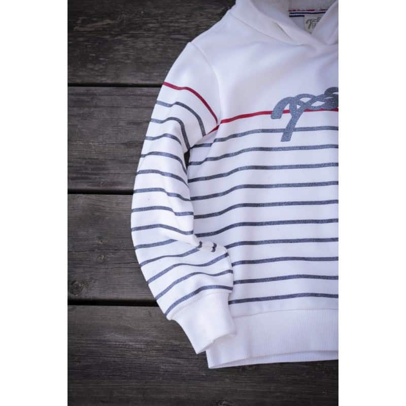 Il a définitivement tout pour plaire : un look sportswear avec une rayure horizontale rouge au-dessus d’autres en lurex marine typiques de la marinière et le logo de la marque au centre. Il va tout naturellement se faire une place dans le vestiaire équestre de nos plus jeunes clientes!