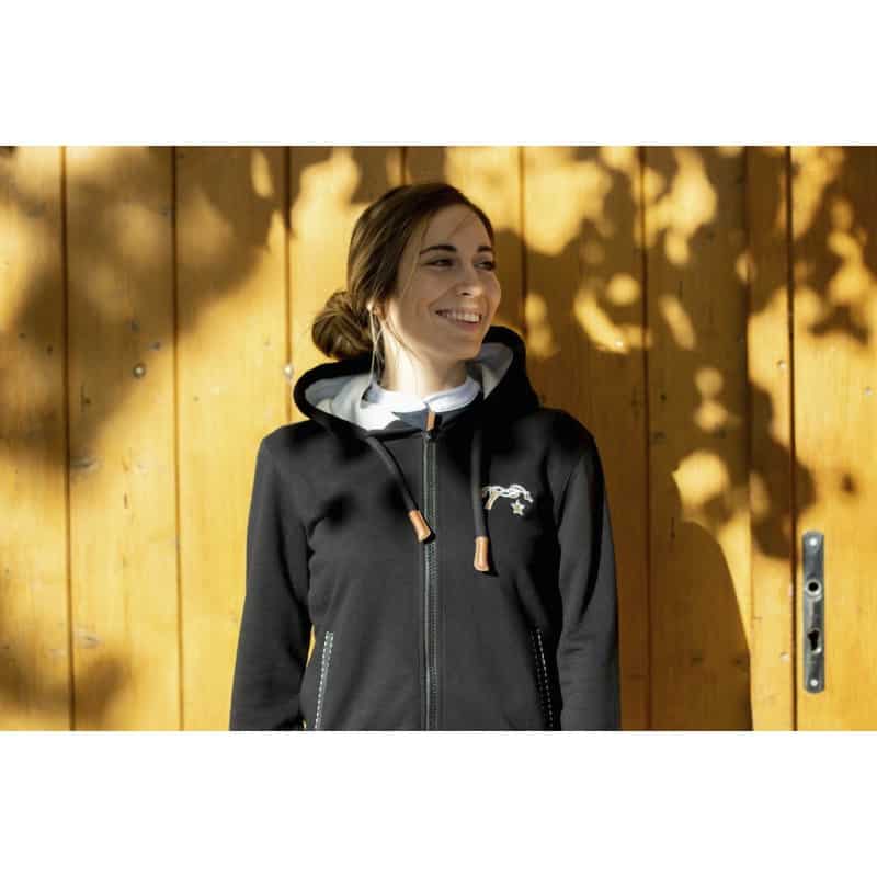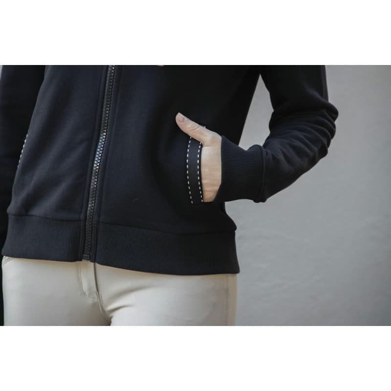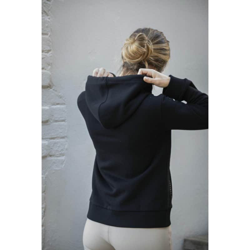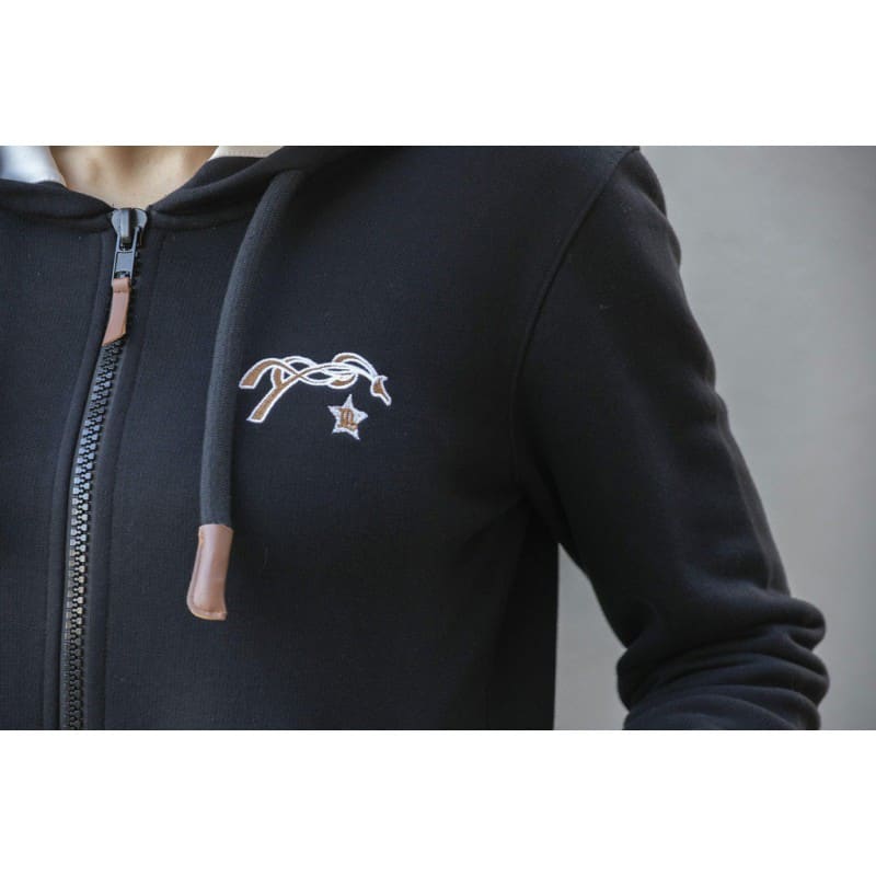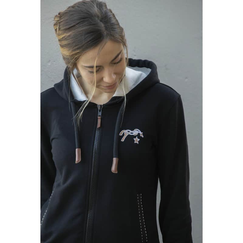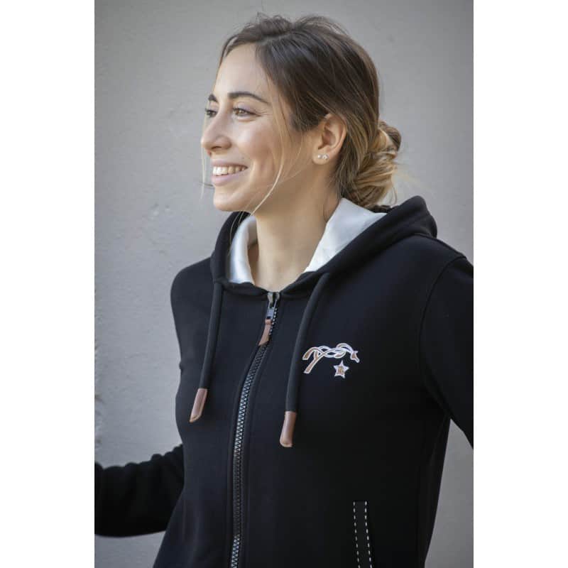 Sweat noir à capuche doublé en polaire crème. Deux poches galonnées d’un point sellier. Cordon de serrage sur la capuche, elle-même doublée de polaire crème. Logo Pénélope brodé sur le cœur dans les coloris crème et caramel.