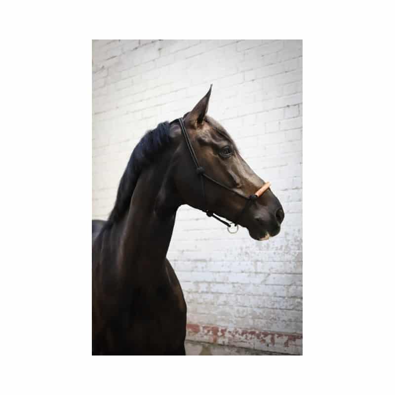 Très proche de son voisin le licol éthologique voici le licol éthologique américain. C’est un modèle en corde composé d’un renfort en cuir au niveau de la muserolle. Ce renfort est cousu d’un épais fil blanc qui contraste avec la couleur noisette du cuir. Il se ferme sur la gauche et se règle grâce à un système de nœuds. Il s’adapte donc à un grand nombre de chevaux. Il peut être également relié à une longe grâce à un anneau au bas de la muserolle. Ce licol peut être utilisé en main mais aussi pour un travail en longe.