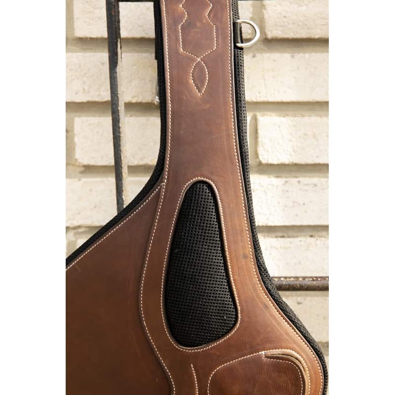 Parce que ce qui nous importe, c’est avant tout le confort de votre cheval, la sangle bavette s’équipe de mousse 3D. La mousse 3D est amortissante et respirante, elle évacue facilement la transpiration de votre cheval tout en étant plus confortable que le cuir. Elle est munie de deux élastiques pour l’attache aux contre sanglon avec des boucles à roulement. Le mousqueton d’attache pour les enrênements est protégé par une patte en cuir aimantée pour éviter toute gêne. Il y a une attache pour enrênement de chaque coté.