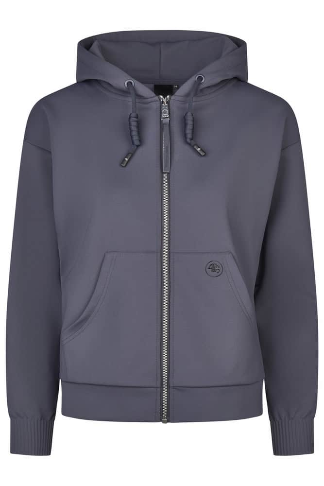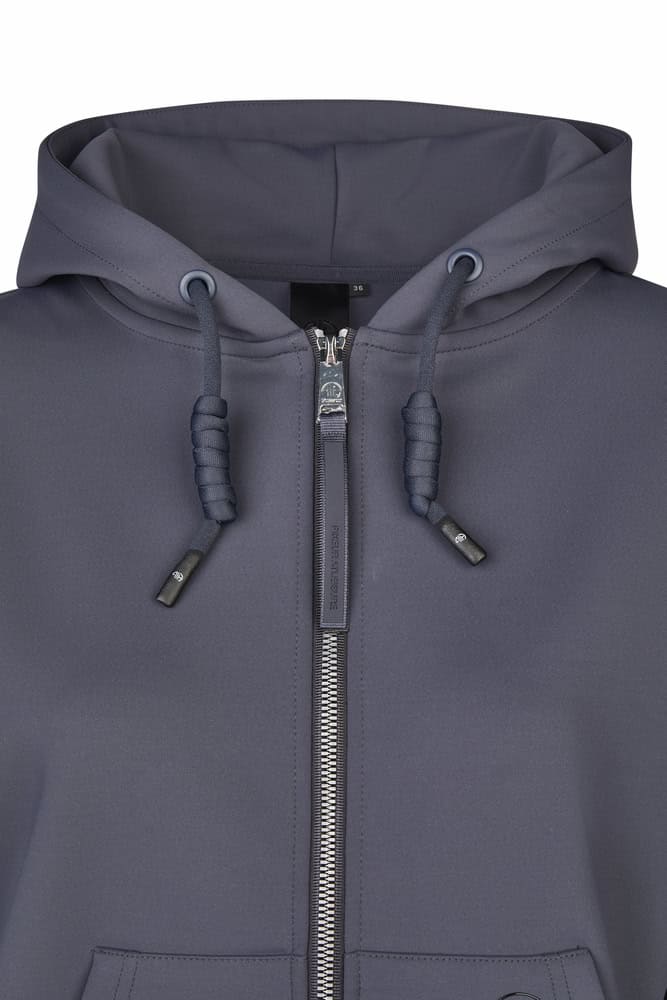 Étiquette Pikeur Athleisure réalisée selon différentes techniques : imprimés métalliques en relief sur la poche et la capuche, grand logo Pikeur en relief
