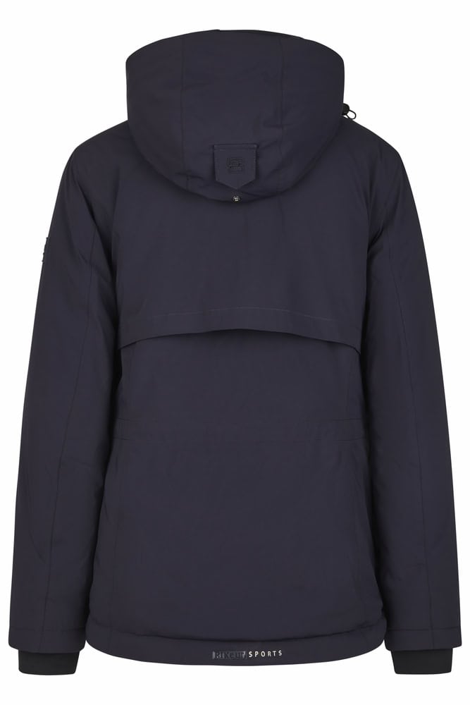 Capuche réglable à l’aide de boutons-pression et d’un cordon élastique.